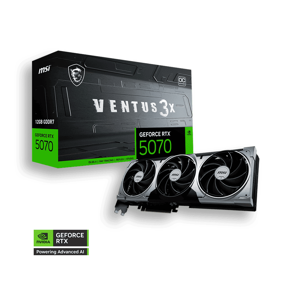 La MSI GeForce RTX 5070 Ventus 3X OC es una tarjeta gráfica potente con 12GB de memoria GDDR7, basada en la arquitectura NVIDIA Blackwell. Ofrece un rendimiento optimizado con DLSS 4, núcleos de trazado de rayos de cuarta generación y un sistema de refrigeración TORX